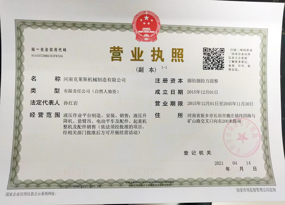 河南克萊斯機械制造有限公司位于河南省長垣市魏莊工業園區,公司注冊資金捌佰捌拾萬元整,在職員工40余名,擁有研發設計團隊,是一家生產液壓升降作業平臺及旋臂起重機生產銷售的廠家。  公司主要產品有:固定導軌式液壓升降作業平臺、移動式液壓升降平臺、車載式液壓升降平臺;定柱式懸臂吊、墻壁吊、電動平車、登車橋等。  精良的設備,嚴格的管理是公司得以不斷發展壯大、產品能夠贏得用戶依賴的根本所在?!  熬_、...... <了解更多>